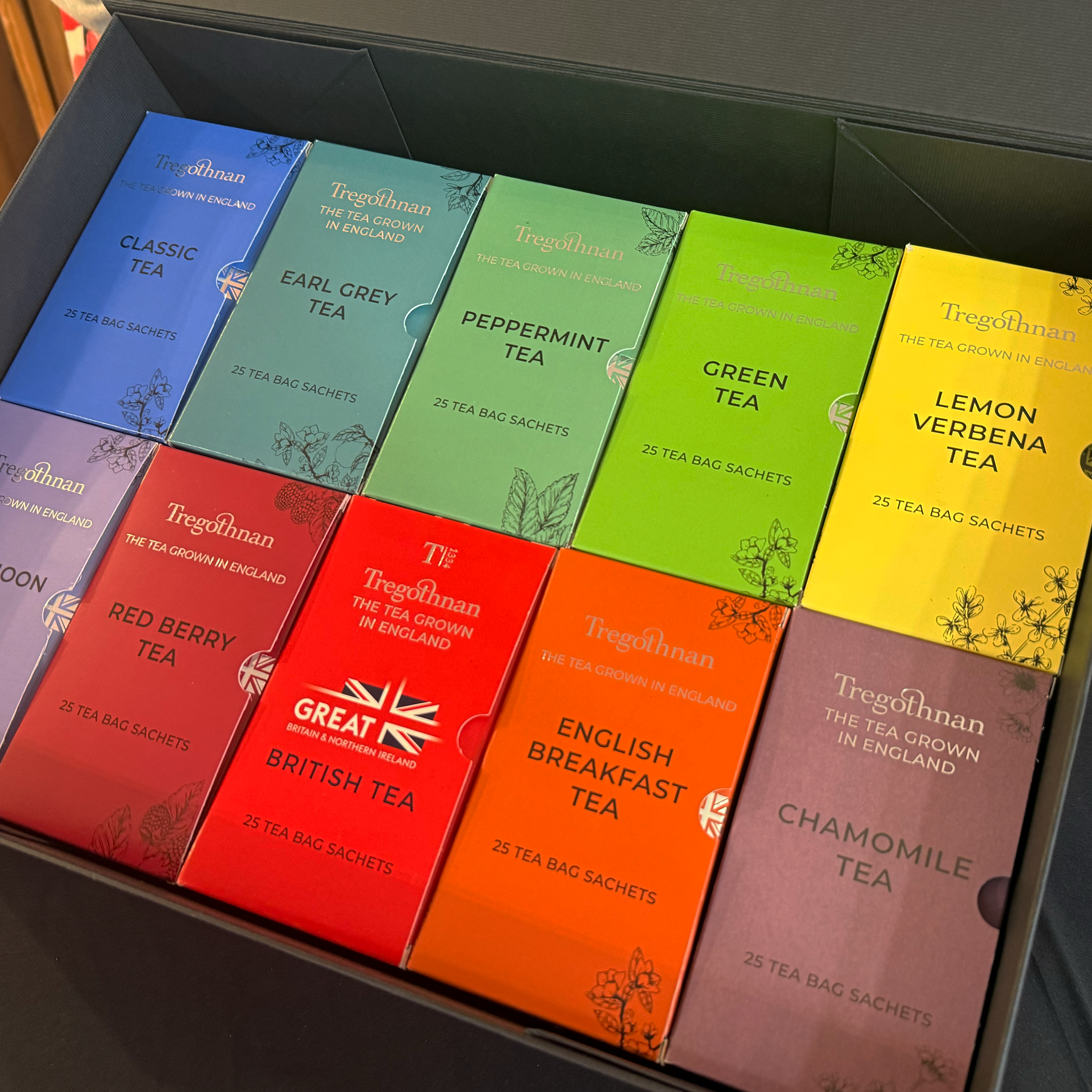 The full core range of Tregothnan 25 Teabag Sachets in one stunning black presentation box.